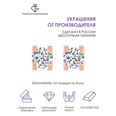 Золотые пусеты - гвоздики  с бриллиантами бренда ТВОЙЛИЧНЫЙЮВЕЛИР наполнены мощной энергетикой - подойдут для девушек и женщин, которые выбирают яркость и эффектность. Роскошное и в то же время лаконичное ювелирное украшение, выполненное из розового золота 585 пробы, подчеркнет Вашу неповторимость и откроет новые возможности для стильных экспериментов. В качестве вставки в серьгах используются бриллианты, способные на свету переливаться всеми цветами радуги и издавать невероятный блеск, придавая своей обладательнице женственность и элегантность. Дизайнерские сережки пусеты, выполненные опытными ювелирами России, оснащены удобной и надежной винтовой застежкой, которая обеспечивает прочную фиксацию ювелирного изделия на Вашем ушке. Тип конструкции делает золотые серьги самыми удобными - они не мешают одеваться, не цепляют волосы и, при правильном подборе размера, не доставляют дискомфорта во время сна. Именно по этой причине серьги из золота часто выбирают не только для взрослых девушек, но и для маленьких модниц. Благодаря минималистичному, продуманному дизайну серьги-гвоздики можно легко сочетать с любыми другими украшениями и нарядами. Такие пусеты из золота никогда не выйдут из моды и всегда будут актуальны. Сережки-гвоздики – одни из самых популярных моделей, они универсальны, и их легко подобрать под любой типаж и образ, стиль одежды, возраст владелицы. Аккуратные и практичные пусеты с бриллиантом - это универсальное украшение для любого образа:  на деловой встрече в комбинации со строгим офисным нарядом, на романтическом свидании, и даже на роскошном приеме. Небольшой размер сережек подчеркивает женственность владелицы и ее элегантность при любых обстоятельствах. Бриллиантовые пусеты идут всем без исключения: блондинкам и брюнеткам, смуглым и светлокожим девушкам, голубоглазым и кареглазым. Если вы хотите быть в центре внимания или же ищете украшение на торжественное мероприятие, то серьги с драгоценными камнями — это ваш вариант! Пусеты поставляются в брендированной упаковке и идеально подходят в качестве замечательного подарка на особую дату или просто так, чтобы восхитить и удивить любимую жену, маму или дочку и оставить неизгладимое впечатление. Купив ювелирные изделия от производителя ручной работы, вы получаете бессрочную гарантию! С любовью и заботой о Вас, ТВОЙЛИЧНЫЙЮВЕЛИР!
